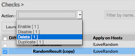 From the Main page First go to the Checks page, from the Main menu, then click on the check box placed on the first column of the table. Use the Action menu on the top to select Delete, and click to the Launch Button. A confirmation popup will be displayed. Using the Main page gives Administrators ability to Delete many Checks at once. | |