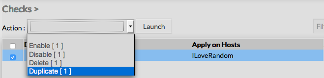 Once selected, the check can be duplicated by selecting Duplicate in the select Action of the tool bar. Duplication is executed by clicking the Launch button.