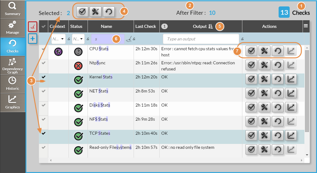 There are the same 3 actions already available in the header plus a fourth action : which opens the Graphs Tab with the check already developed.