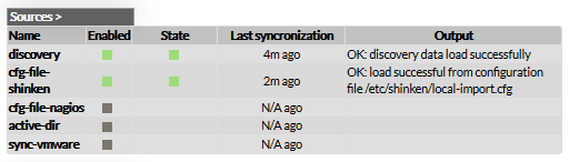 Sources Sources table shows, for each known source: Its name. If the source is enabled or not. The state of the source (if enabled). - green if it's running well