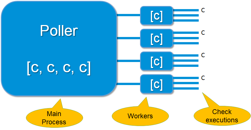 Le démon poller lance les sondes tel que demandé par les schedulers. Quand la vérification est terminée, il renvoie le résultat aux schedulers. Les pollers peuvent être définis pour des vérifications spécifiques (ex. Windows versus Unix, clientr A versus client B, DMZ). Il peut y avoir plusieurs pollers pour des questions de load-balancing .