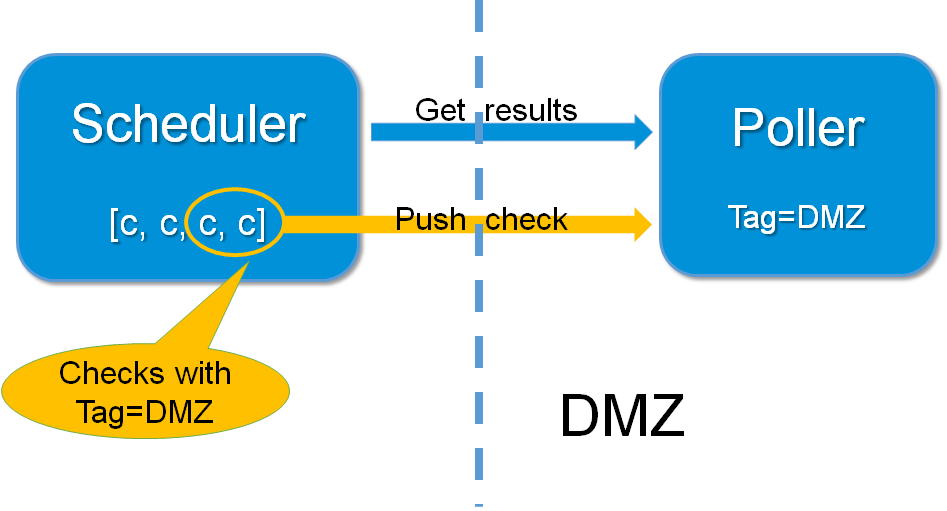 Il est possible de définir un poller en DMZ , et les schedulers dans le LAN. Dans ce cas, l'objectif est d'éviter les connections de DMZ (poller) vers LAN (schedulers) .Il est alors possible de définir le poller comme passif. Le scheduler va alors ouvrir une connexion vers le poller.