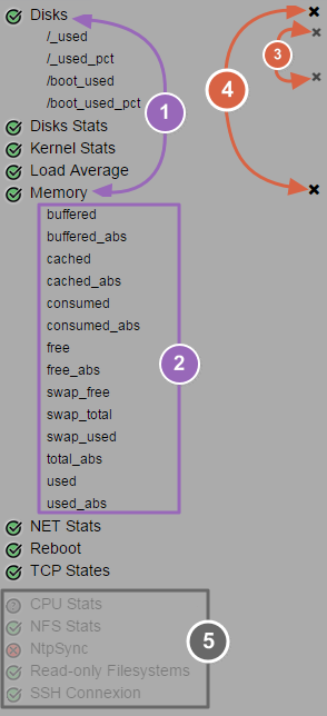 (1) Cliquer sur le nom du check pour faire apparaître la liste des metrics (2) Cliquer sur celui choisi pour le sélectionner (3) Pour le désélectionner, cliquer sur la croix à droite du nom (4) Pour les désélectionner tous, cliquer sur la croix devant le nom du check (5) Les checks sans metrics sont grisés en bas de liste |