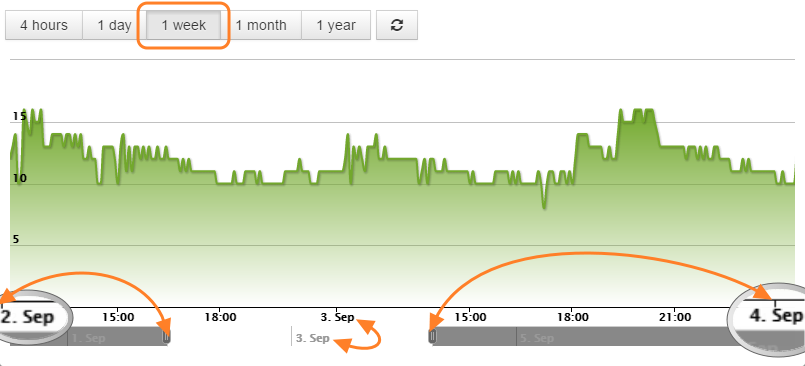Dans cet exemple, la période choisie est "1 Semaine", mais le zoom de temps est à 2 jours dans cette semaine (2. Sept → 4. Sept).