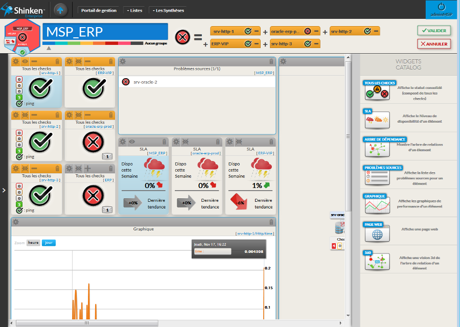 Par exemple, vous pouvez dédier un tableau de bord pour superviser un ERP, et contenant toutes les informations liées nécessaires à son bon fonctionnement. :