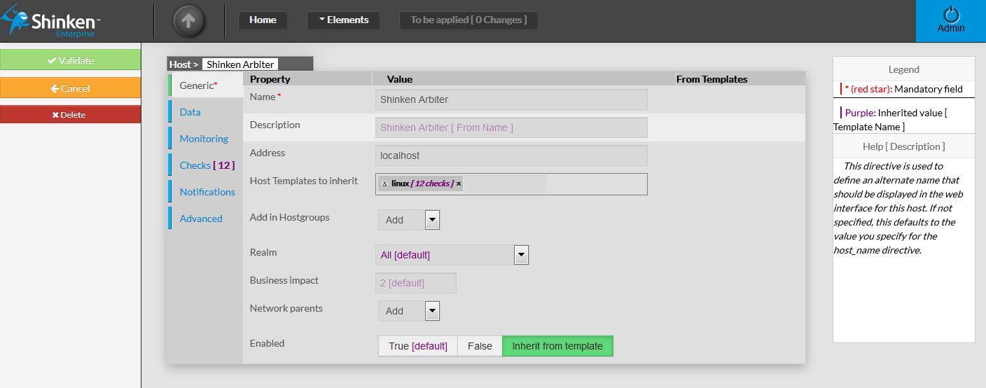 • Inherited Template values will be used only if the property is not set in the element (in the example, Business impact is set to 2, so the inherited value 1 from Shinken Host is displayed but not applied)