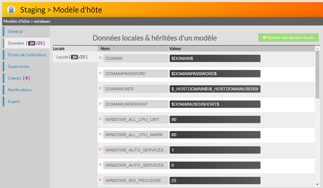 Pour un hôte qui hérite par exemple du modèle windows de notre pack, ces données seront donc héritées également, mais elles pourront aussi être surchargées directement sur l'hôte (attention aux conflits de nom des données).
