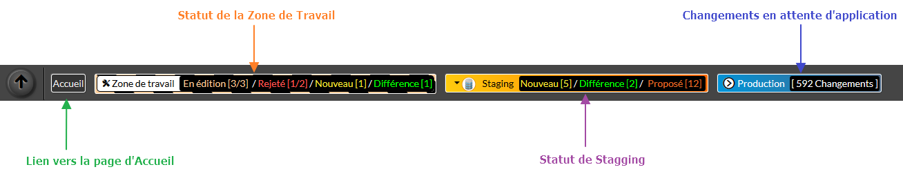• en statut de stagging : 5 nouveaux éléments (dont 1 cluster, 2 Check et 2 Utilisateurs), 2 différence sur les modulations et 12 propositions de modifications sur les hôtes provenant de la Zone de travail.