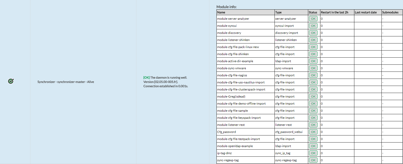 | Synchronizer - $KEY$ - Alive | Vérifie que le démon Synchronizer peut être correctement contacté sur le réseau. Son numéro de version est affiché. | |
