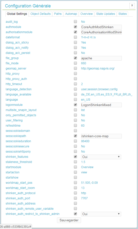 | shinken_auth_address | Vide | Adresse du module webui à contacter (exemple: 192.168.0.3). Lorsque ce champ est vide, l'adresse du backend par défaut configuré dans NagVis est utilisée. Dans la majorité des cas, il ne sera pas nécessaire de spécifier une adresse particulière. |