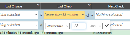 Some columns such as "Last check" may contain dates . The duration filter will allow you to display only those elements that have a date that is either less or greater (depending on the type of filter desired) than the duration of the filter..