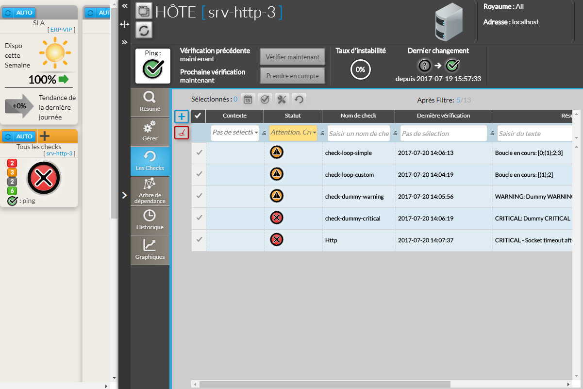 • Elle permet également d'effectuer des actions précises sur les hôtes/clusters/checks, d'accéder à l'arbre de dépendance, à l'historique ou encore aux graphiques.