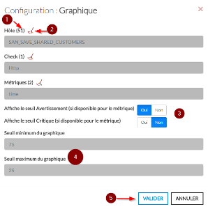 Les Graphiques sont liés à une métrique, qui est elle même reliée au à un check d'un hôte. Vous devez donc tout d'abord définir l'hôte concerné, puis le check associé et enfin quelle valeur métrique vous souhaitez afficher.