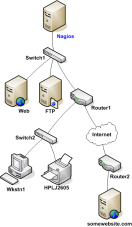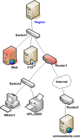 Regardons le diagramme réseau ci-joint et imaginons qu'on supervise tous les hôtes (serveurs, routeurs, switches, etc) | |