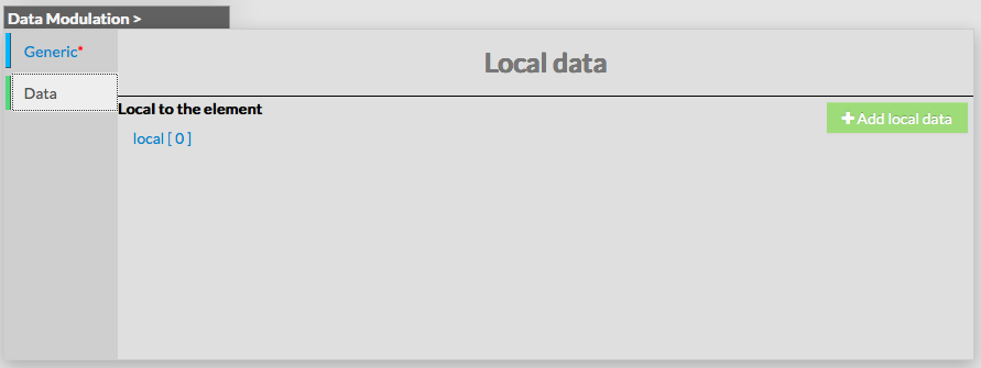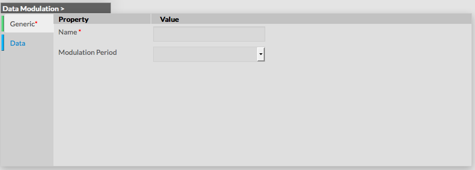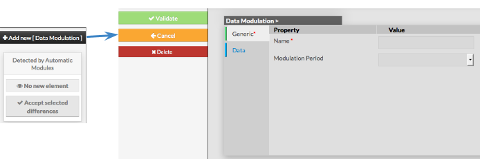 Pour créer une nouvelle modulation de Données, utiliser le bouton "Ajouter nouveau [DATA Modulation]" situé dans le menu Action Le formulaire apparaîtra, avec 2 catégories