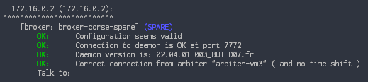 Le cas de l'Arbiter spare est un cas particulier. Puisqu'il a un rôle central, lorsqu'il démarre, il agit automatiquement comme arbitre avec les autres démons. Dans le cas d'un spare, on veut par contre qu'il reste inactif et n'essaye pas d'envoyer de configuration aux autres démons.