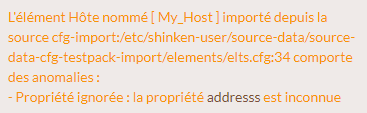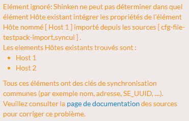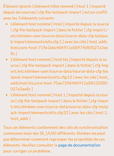 Mais, quand un élément d'une source a plusieurs éléments distincts avec lesquels il peut être fusionné, Shinken ne peut pas décider avec quel élément le fusionner. Dans ce cas, plutôt que de choisir arbitrairement un élément pour la fusion des propriétés, Shinken affiche un avertissement indiquant le problème.