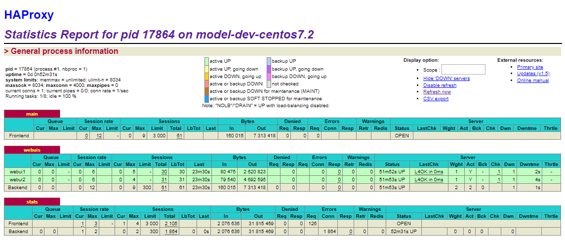 backend webuis mode tcp balance roundrobin server webui1 127.0.0.1:8767 check fall 1 rise 1 inter 1s server webui2 127.0.0.1:9767 check fall 1 rise 1 inter 1sMise à disposition d'une page de statistiques HAProxy: HAProxy permet de mettre à disposition une page qui présente en temps réel l'état des backends (dans notre cas les 2 WebUI).