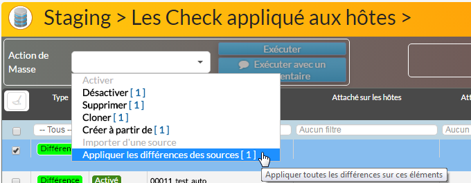 Pour appliquer ces différences dans Staging, il suffit alors de sélectionner les éléments en Nouveau ou en Différence, puis de sélectionner l'Action de masse adéquat.