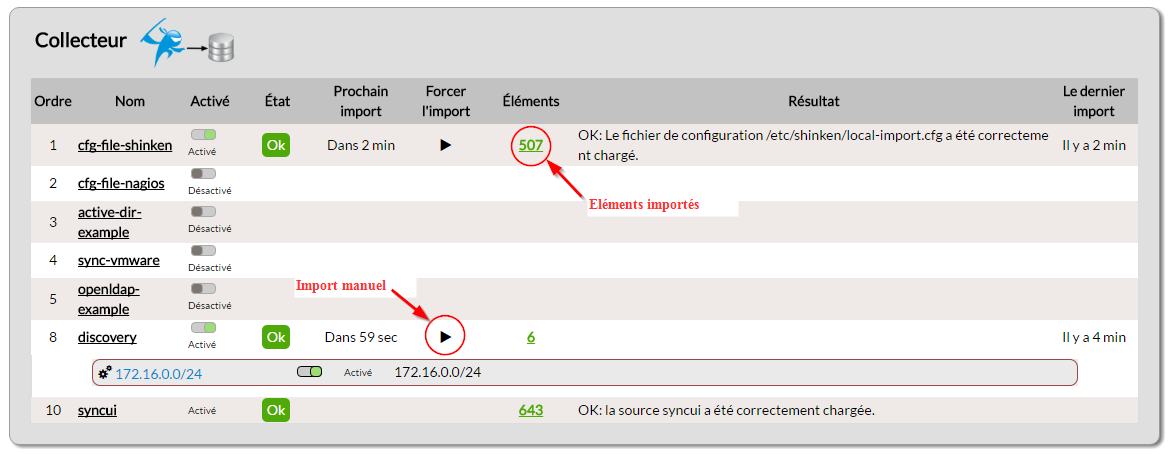 Après import, les objets importés sont fusionnés lorsque nécessaire (par exemple, si deux sources importent des hôtes de même adresse), en respectant leur ordre.