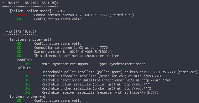 On voit dans l'exemple ci-contre qu'un Poller est installé sur la machine d'adresse 192.168.1.35, et qu'un Arbiter et un Broker sont installés et activés sur la machine vm3 (172.16.0.3).