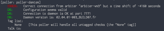 Dans l'exemple, le poller "poller-domtom" possède un décalage horaire de 4160 secondes avec l'Arbiter "arbiter-vm3".