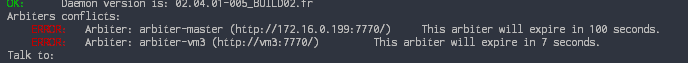 Dans ce cas, plusieurs Arbiters envoient une configuration contradictoire au même démon. Dans ce cas, une erreur est affichée dans le healthcheck indiquant le conflit d'Arbiter.