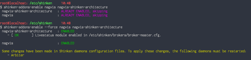 Les commandes d'activation et de désactivation peuvent entrer en conflit avec des changements de configuration manuels. Par exemple, l'activation des addons "nagvis" et "nagvis-shinken-architecture" activent le module Livestatus sur le Broker.