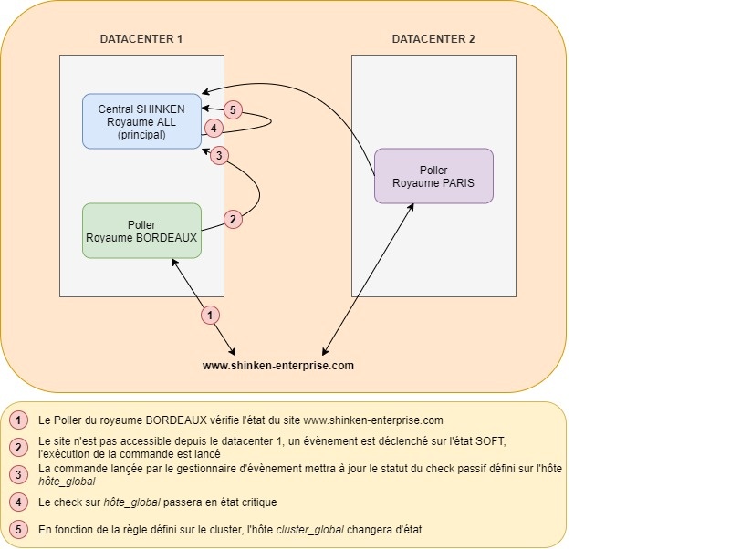 Prenons par exemple la surveillance d'un site internet www.shinken-enterprise.com dans 2 royaumes différent et le résultat sera envoyé sur un hôte hôte_global dont les checks seront appelés via un cluster nommé cluster_global :
