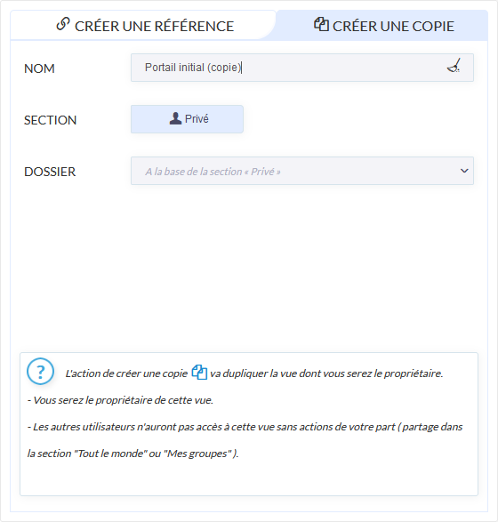 - Une référence ( Un lien en lecture seul ) : les utilisateurs qui voient cette référence peuvent accéder à la vue correspondante, mais seul le propriétaire pourra modifier le contenu de la vue.