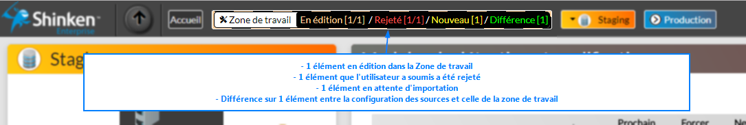 Cette barre indique le nombre d'éléments qui diffèrent entre les données présentes dans l'espace de Staging et l'espace de Production.