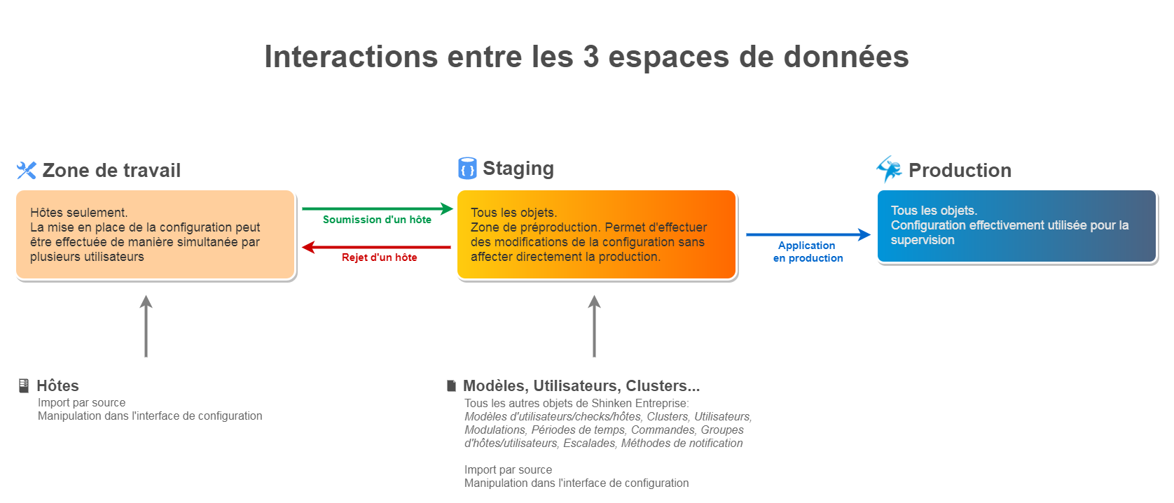 Enfin, l'espace de Staging permet d'ajouter un espace destiné aux modifications avant l'application, mais il permet difficilement le travail collaboratif. La zone de travail est un espace permettant de travailler simultanément à plusieurs utilisateurs sur la même configuration. Certains utilisateurs peuvent modifier des éléments dans la Zone de travail, puis les administrateurs Shinken vérifient et acceptent les modifications de ces éléments dans Staging.