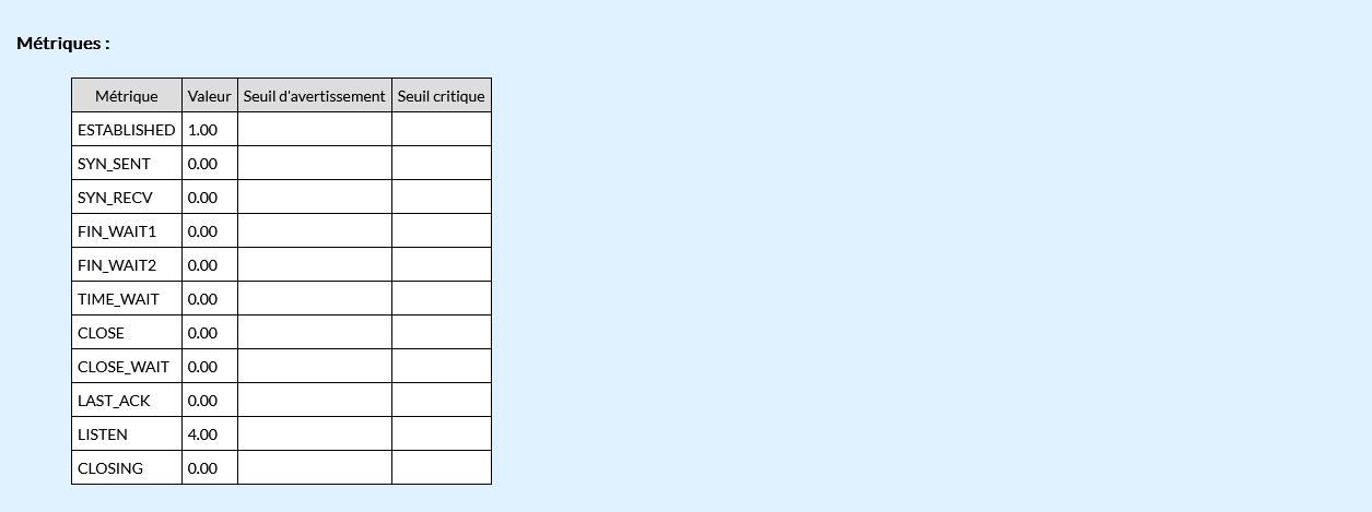 | LAST_ACK | -- | Nombre de ports en attente d'une confirmation après avoir envoyé un FIN. | -- | -- |