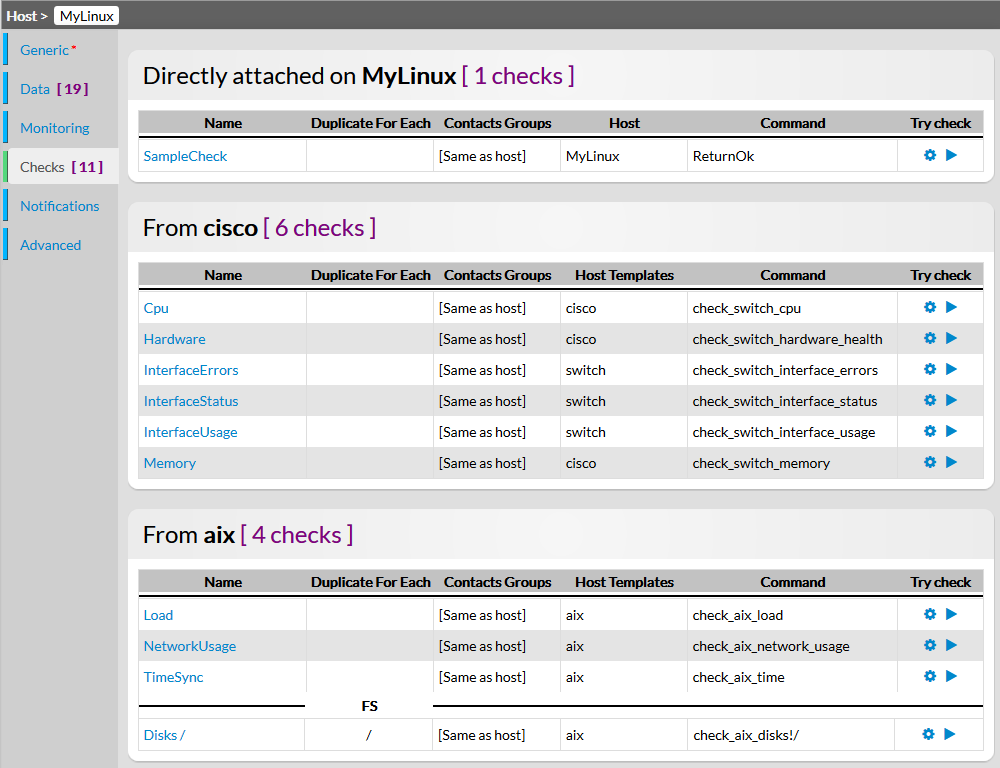 Cet onglet résume quels sont les Checks qui seront appliqués à l'hôte, et leur provenance (venant de quel template d'hôte, ou directement appliqué à l'hôte).