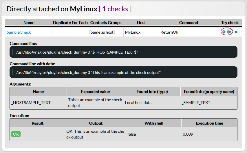 Les boutons dans la colonne Try check permettent d'essayer directement l'exécution d'un check, avec la résolution de ses données.