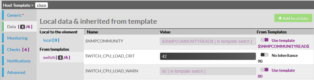 Utiliser un template, ou hériter d'un template, permet de récupérer toute sa configuration : ses données, et, dans le cas d'un templates d'hôte, d'obtenir tous les checks qui lui sont attachés. Il est à noter qu'un template peut également hériter à son tour d'un autre template.