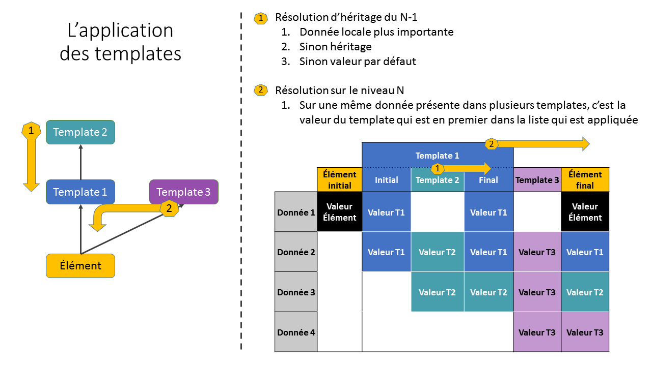 Un élément peut utiliser tout ou partie de la configuration de ses templates. Il peut redéfinir (ou surcharger) des donnés qui étaient définies dans le templates, ce qui permet la gestion de cas particuliers.